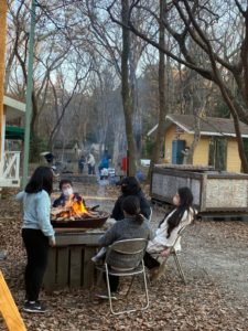 ☆キャンプファイヤーの近くでは、あっちゃん先生の「火燃やし中級」。