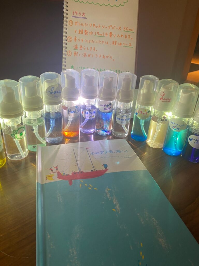 全員集まったので『まきちゃんのあわあわ石けん作り』ワークショップをしました。